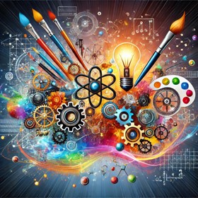 Criei esta imagem com a IA para vos inspirar. Representa o conceito STEAM (Ciência, Tecnologia, Engenharia, Artes e Matemática). Está projetada de forma a capturar a criatividade e a inovação através de elementos visuais interconectados, como engrenagens, circuitos e pincéis, simbolizando o equilíbrio entre arte e ciência.